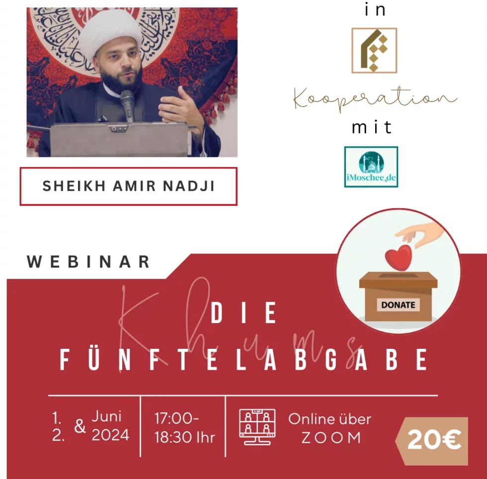 Das Webinar befasst sich mit einer wichtigen islamischen Pflicht, die in unseren Gesellschaften oft vernachlässigt wird: Die Fünftelabgabe (Khums).Inwiefern der Islam diese vorschreibt und was die Fünftelabgabe genau vorsieht, erfahrt ihr im zweitägigen Webinar am 18. und 19. Mai.